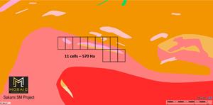 Finally, the Sakami SM project, made up of 11 cells covering an area of 570 hectares, is in contact with a biotite paragneiss and a white pegmatitic granite and an alkali feldspar and biotite and muscovite, tourmaline, garnet, and beryl in the Lake Sakami area.