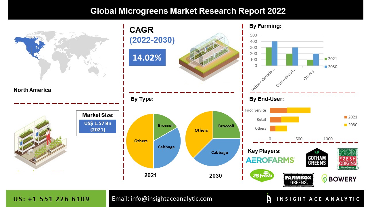 NEW JERSEY, NJ, USA, December 1, 2022 /EINPresswire.com/ -- InsightAce Analytics Pvt. Ltd. announces the release of a market assessment report on the "Global Microgreens Market By Type (Broccoli, Cabbage, Cauliflower, Arugula, Peas, Basil, Radish, Cress, Others), by Farming (Indoor vertical farming, Commercial greenhouse, Others), by End User (Retail, Food Service, Others):)- Market Outlook and Industry Analysis 2030"