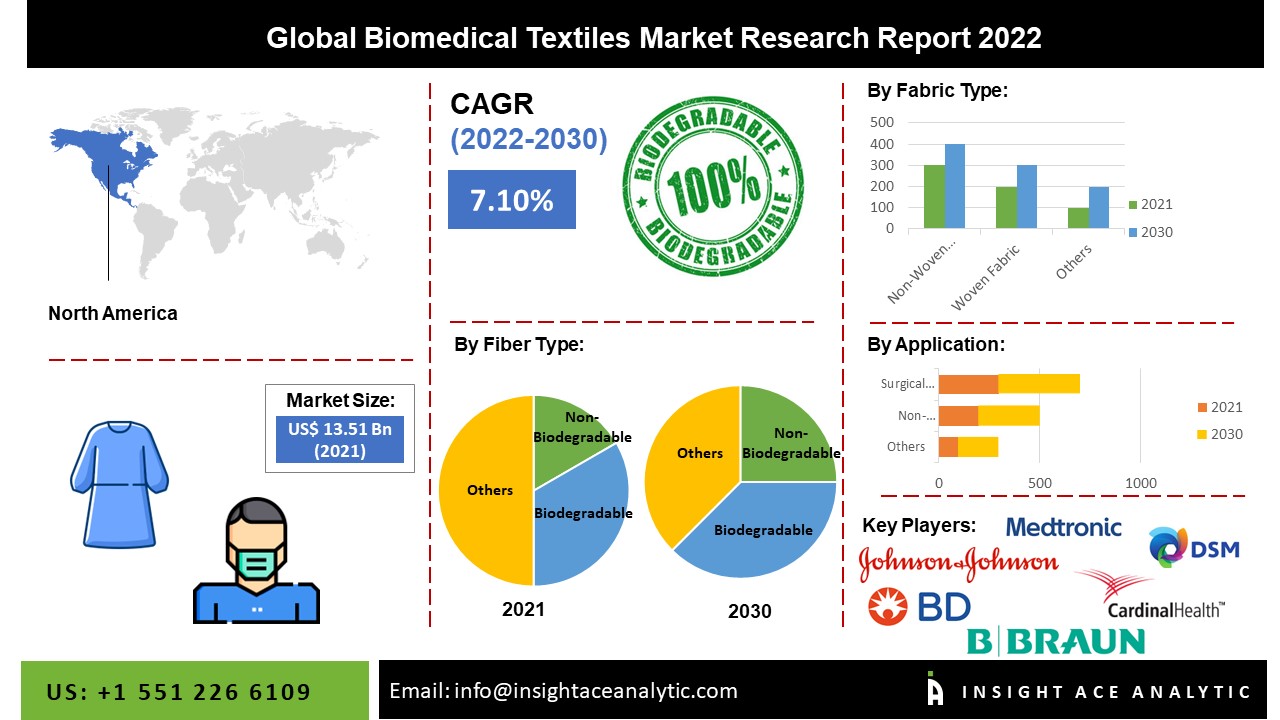NEW JERSEY, NJ, USA, December 5, 2022 /EINPresswire.com/ -- Insight Analytics Pvt. Ltd. announces the release of a market assessment report on the "Global Biomedical Textiles Market By Type (Biodegradable, Nonbiodegradable), Fabric Type (Woven, Non-woven), Application (Non-implantable, Surgical Sutures))- Market Outlook and Industry Analysis 2030"