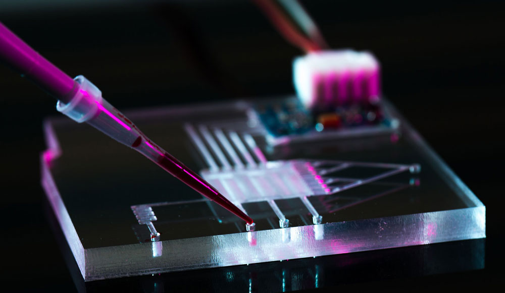 Microfluidics is the technology that deals with the flow of liquids through microscopic channels such as chips, nozzles, and pumps