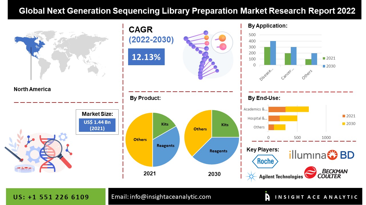NEW JERSEY, NJ, USA, December 5, 2022 /EINPresswire.com/ -- Insight Analytics Pvt. Ltd. announces the release of a market assessment report on the "Global Next Generation Sequencing Library Preparation Market (By Sequencing Type (Targeted Genome Sequencing, Whole Genome Sequencing, Whole Exome Sequencing, and Other Sequencing Types), By Product ( Reagents & Consumables (DNA Library Preparation Kits, Library Preparation Kits, RNA Library Preparation Kits, Other Reagents & Consumables) And Instruments), By Application (Drug & Biomarker Discovery, Disease Diagnostics (Cancer Diagnostics, Reproductive Health Diagnostics, Infectious Disease Diagnostics, Other Disease Diagnostic Applications), Drug Discovery And Other Applications), By End-Use (Hospitals And Clinics, Academic And Research Institutions, Pharmaceutical and Biotechnology Companies, and Others))- Market Outlook and Industry Analysis 2030"
