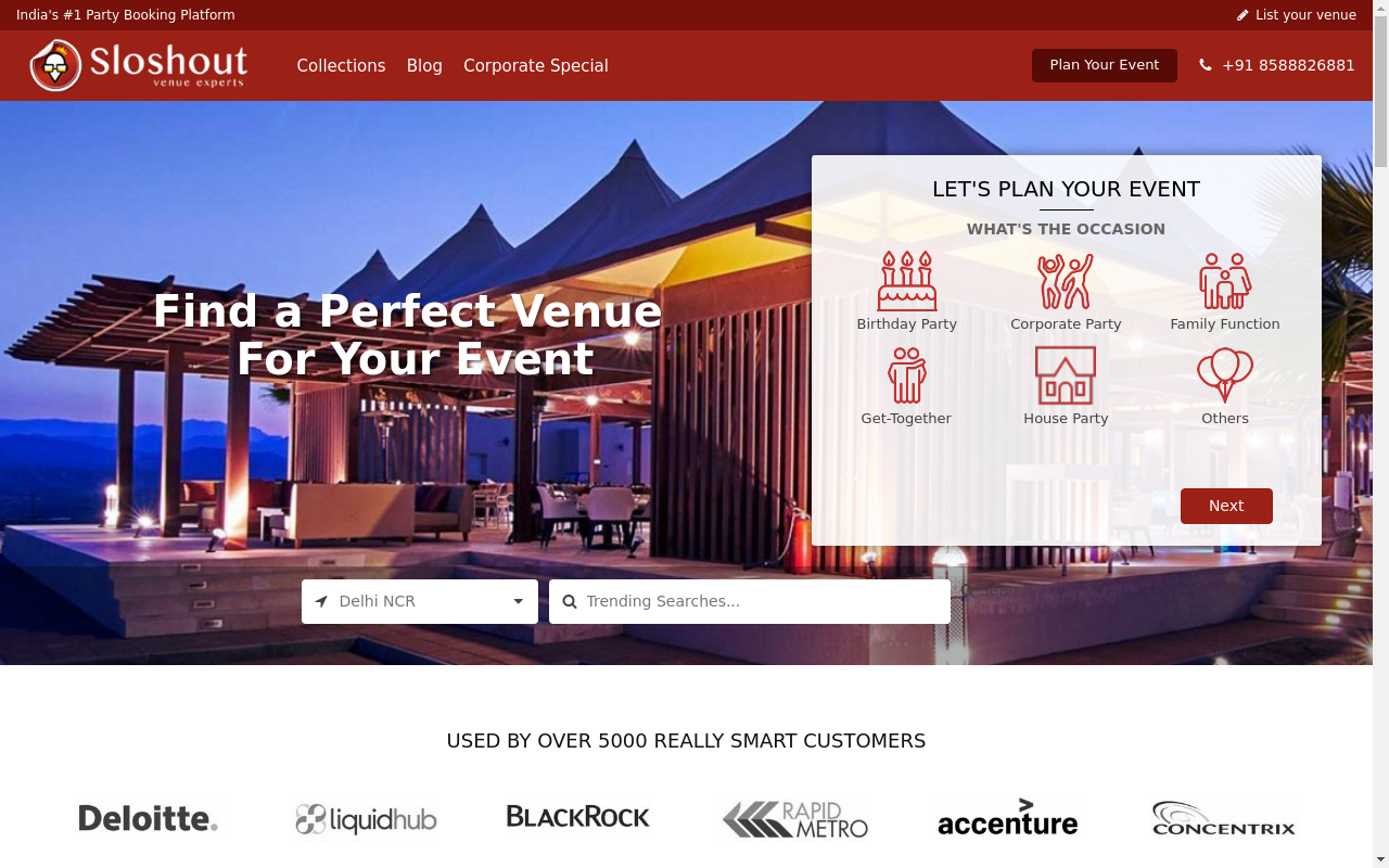 All different kinds of locations across the nation, including farmhouses, villas, restaurants, and banquet halls, are included in its extensive directory of locations. Their recommendations are based on a number of important variables, including your city's population, location, and event kind. Customers can easily look through all of their listings, visit any of their event venues, speak with the owner, haggle over rates, and then make a reservation at the venue of their choice while simply sitting at home. No fees are ever assessed by Sloshout for any bookings or searches made by their customers.