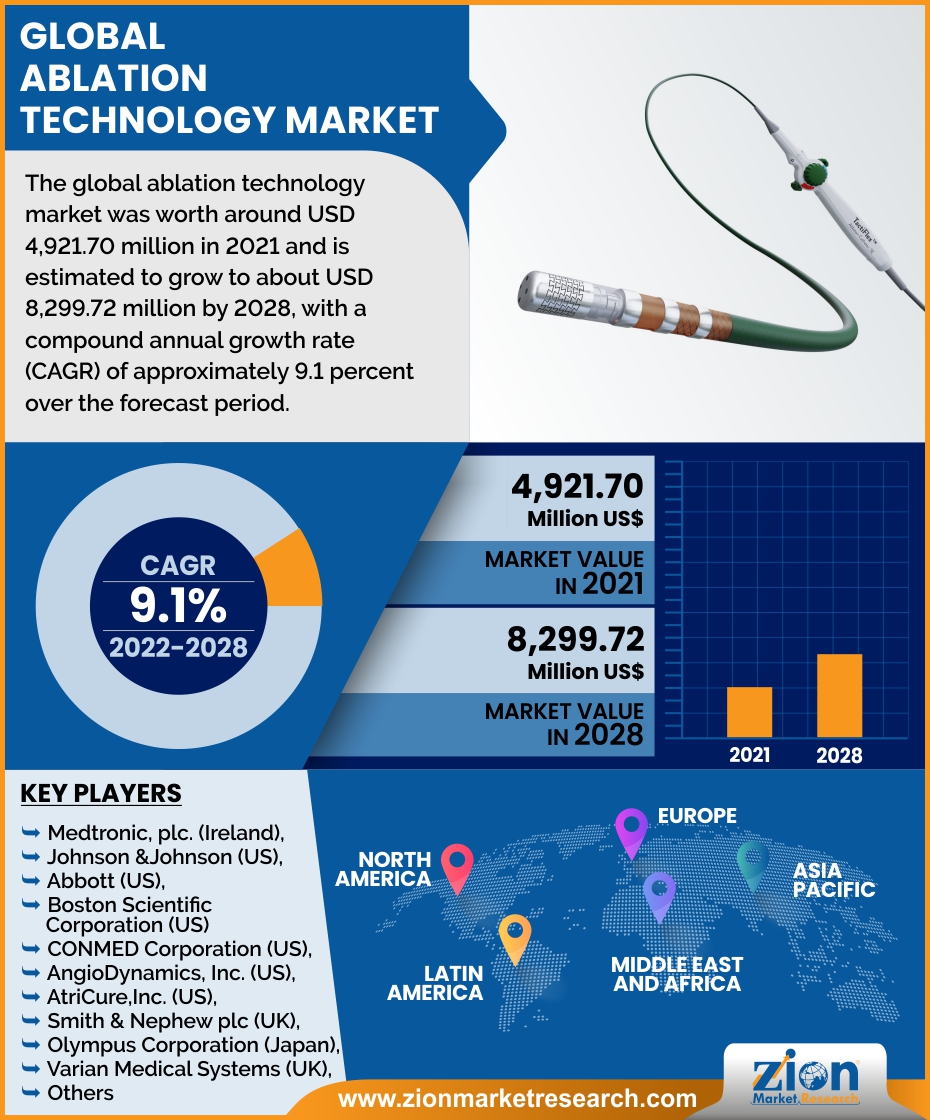 The global ablation technology market Size was worth around USD 4,921.70 million in 2021 and is estimated to grow to about USD 8,299.72 million by 2028