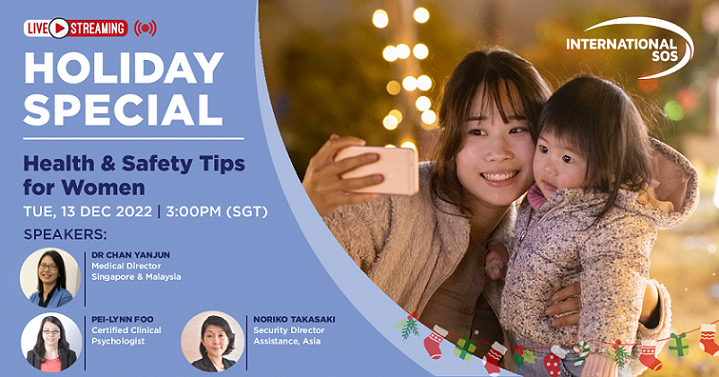 The first episode – “Holiday Special: Health and Safety Tips for Women” will be taking place on 13 December 2022 at 1.30pm (Malaysia time) and will feature International SOS’ experts, including Dr Chan Yanjun, Medical Director, Singapore & Malaysia, International SOS; Pei-Lynn Foo, Certified Clinical Psychologist, International SOS; and Noriko Takasaki, Security Director Assistance, Asia, International SOS. The panel will be providing advice and guidance that is essential for any traveller, but specifically tailored for female travellers and their employers. There will be 10 livestreams in the series and they will be available to view on the International SOS LinkedIn page and Facebook page. For more information or to register for episode one, visit the International SOS events website.