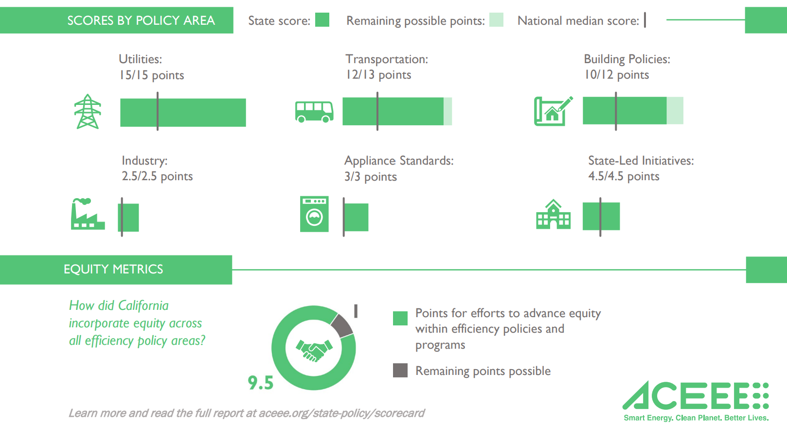For the second year in a row, California led the nation in clean energy standards and efficiency. According to the report, “California strengthened its commitment to decarbonizing its economy by 2045 with a sweeping legislative package of climate measures signed in 2022. It continues to set an example for other states with its leadership in building energy codes and vehicle emissions, and progress on energy efficiency in the utilities sector.