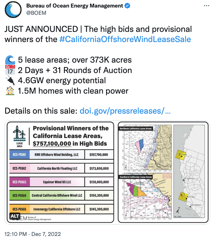 Tuesday marked the first-ever offshore wind lease sale for America’s West Coast, a significant milestone in California’s transition to 90% clean energy by 2035. It was also the first U.S. sale in support of commercial floating offshore wind development.