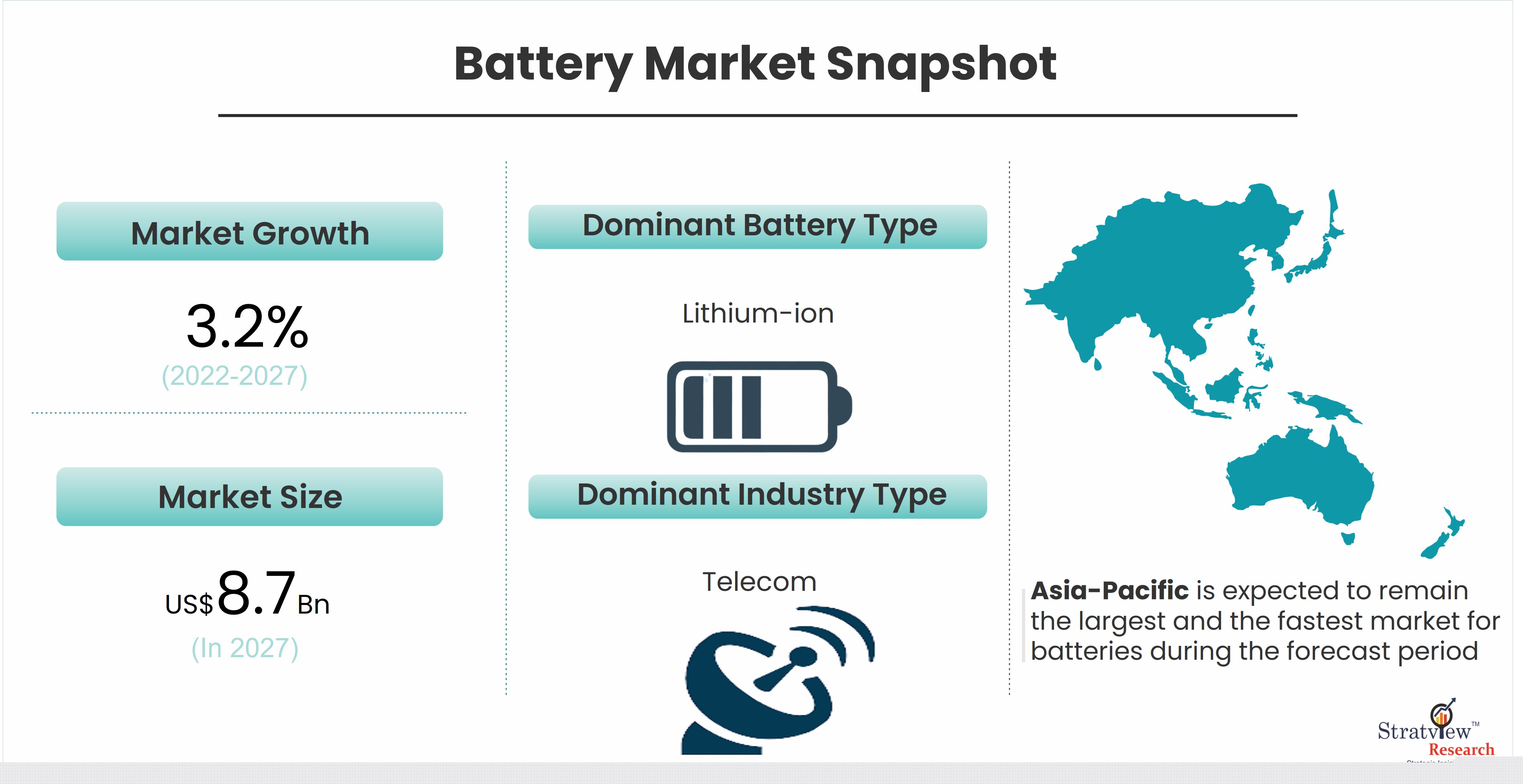 The battery market is likely to rebound at a promising CAGR of 3.2% in the long run to reach US$ 8.7 Billion in 2027; states Stratview Research.