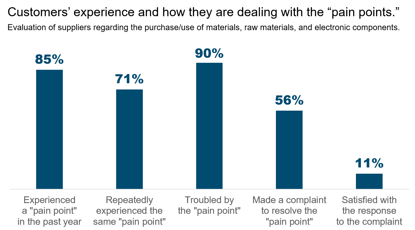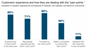 In the case of businesses dealing with the supply of materials (i.e., materials, raw materials, and electronic components), 85% of customers have experienced some form of “pain point” (meaning dissatisfaction or disappointment) within the past year, while 71% repeatedly experienced the same “pain point” and 90% are troubled with it. Moreover, despite the high percentage of customers who have felt such “pain points,” only 56% of those who did so would contact the suppliers to make a complaint. In addition, considering the critical impact on the business, just 11% are satisfied with the supplier’s response to complaints.