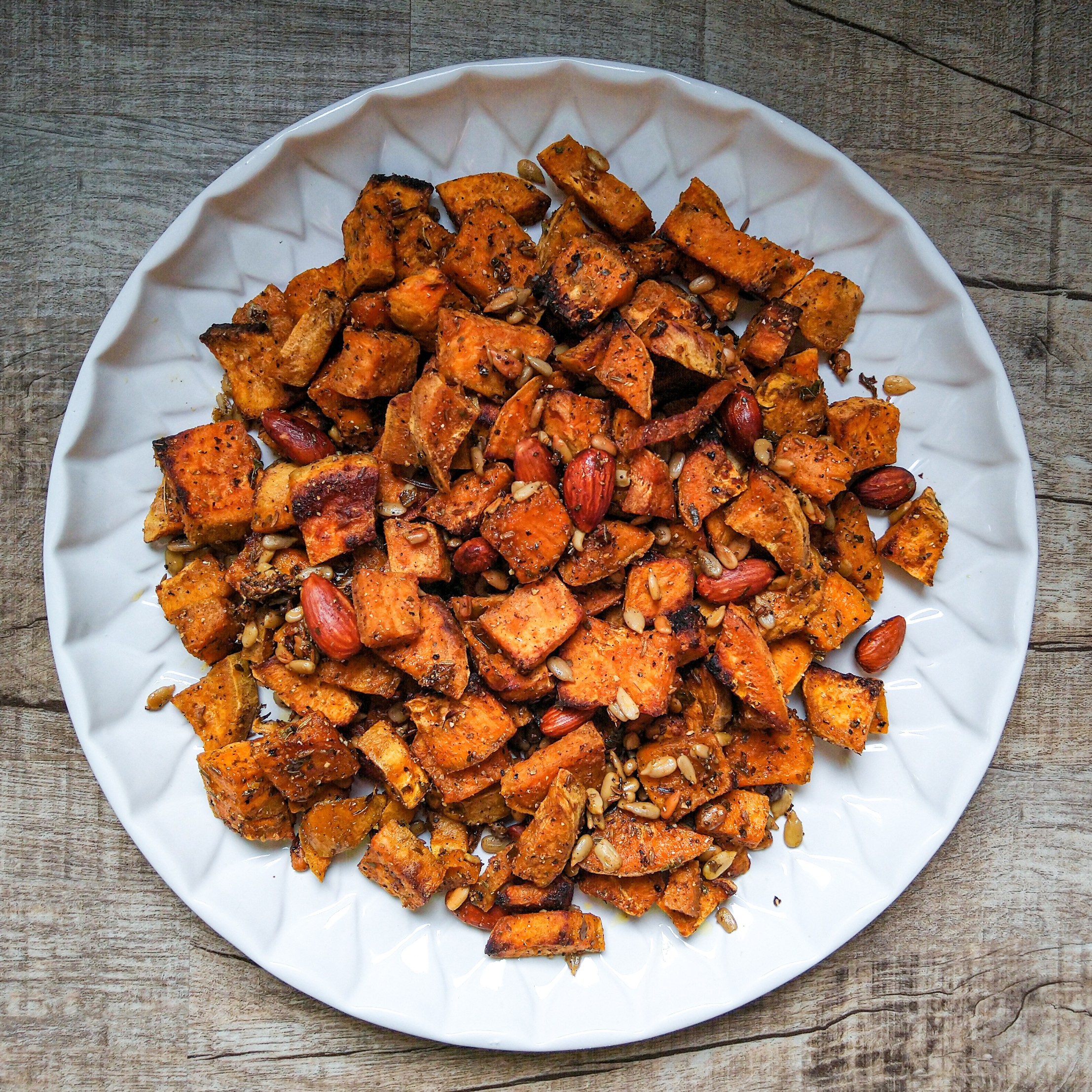 2. Schneiden Sie die Süsskartoffeln wie abgebildet in kleine Stücke (etwa 2cm große Würfel). Die Süßkartoffeln mit dem Olivenöl und den restlichen Zutaten bedecken und gut vermischen.