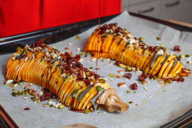 Backen: Kürbis mit Folie zudecken und bei 180 Grad ca. 30 Min. backen.