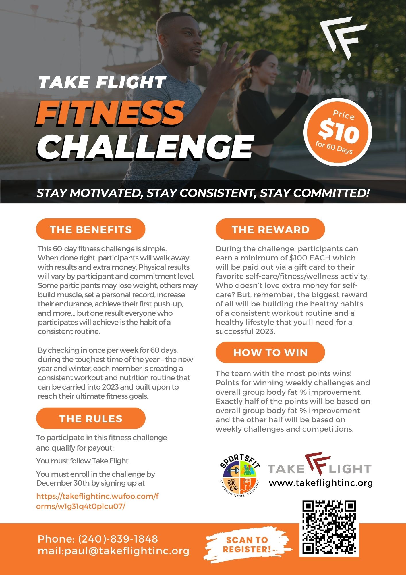 “Our 60-day Fitness Challenge is simple, and if done right, participants will walk away with a consistent new routine that they can carry with them through 2023 and beyond,” said Take Flight Founder Paul Williams. “The Challenge aims to generate fitness results and create positive new habits that will help participants achieve their ultimate fitness goals.”