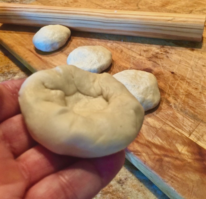 6. Divide the dough into 18 balls. Form each ball into a “testal,” a little round pillow with an indentation in the middle as described above. The indentation in the middle and the fat edges will make rolling a snap.