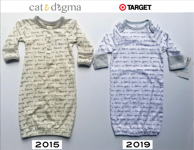 In Cat and Dogma, LLC v. Target Corporation, case number 1:19-cv-01002-LY filed in the U.S. District Court for the Western District of Texas, Cat & Dogma sought damages against Target for its unauthorized use of Cat & Dogma's copyrighted design in infant clothing.
