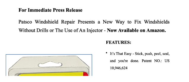 - Patsco Windshield Repair Presents a New Way to Fix Windshields Without Drills or The Use of An Injector - Now Available on Amazon