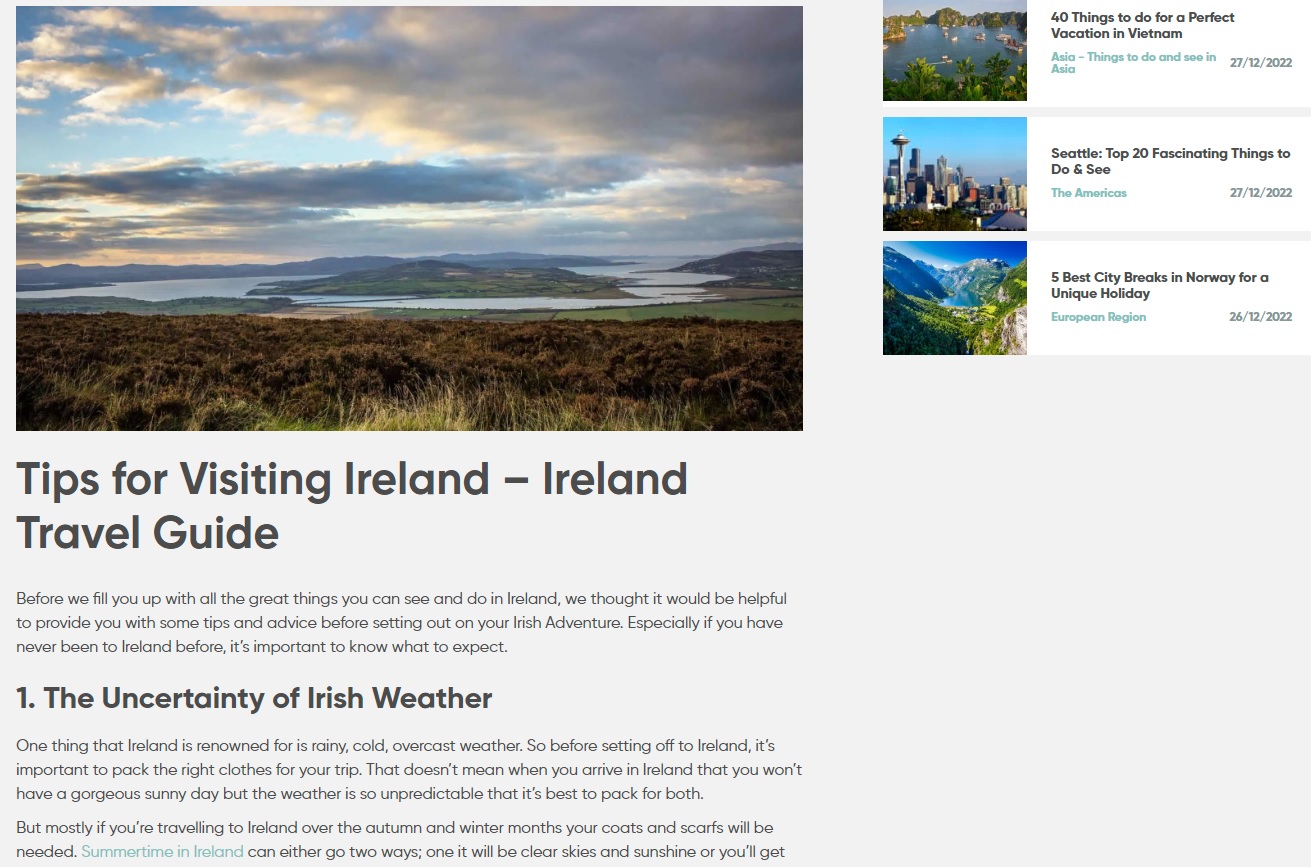 Ireland Travel Guide Blog - Travel and tourism statistics for Ireland have shown a rapid recovery in 2022 following the pandemic. The country is experiencing a steady rise in tourism, which has increased the demand for tourist advice and information. Again, ConnollyCove Ireland is responding to this demand by providing a range of travel blogs, travel guides and videos for tourists who are planning their trip to the Emerald Isle.