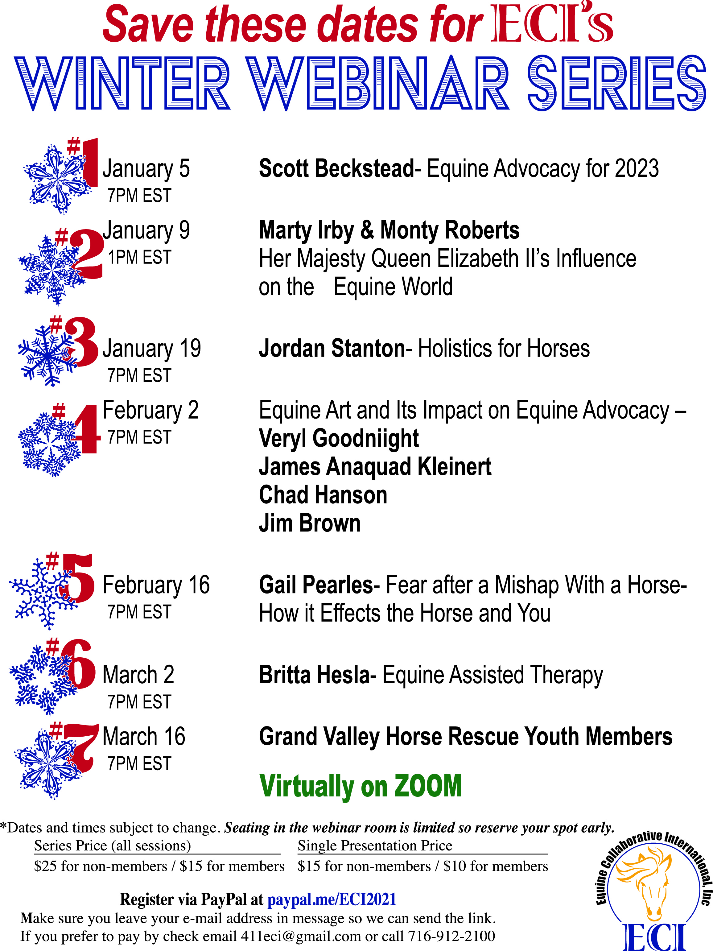 Equine Collaborative International, ECI, will hold its first Winter Webinar Zoom event on January 5, 2023. The conference call begins at 7:00 PM EST. The full series schedule is below.