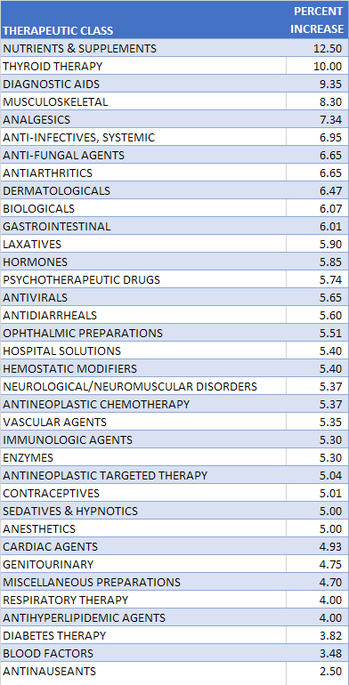 When grouping brands into their respective therapeutic class, Nutrients & Supplements had the highest percent increase at 12.50%, followed by Thyroid Therapy and Diagnostic Aids at 10.00% and 9.35% respectively. See chart for the complete list of therapeutic classes with price increases.