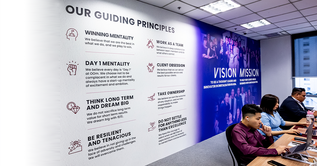 The new office housed a mural wall with OOm's beliefs, values and guiding principles. The murals state OOm's Vision: To be a thought leader and innovator in Asia: and OOm's Mission: To help our clients win in business with digitalisation.