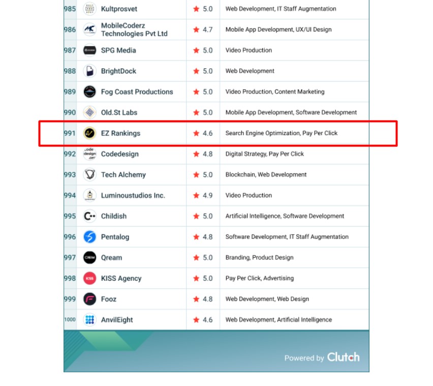 EZ Rankings has joined the prestigious list of Clutch's Top 1000 Front Runner Companies in the Year 2022.