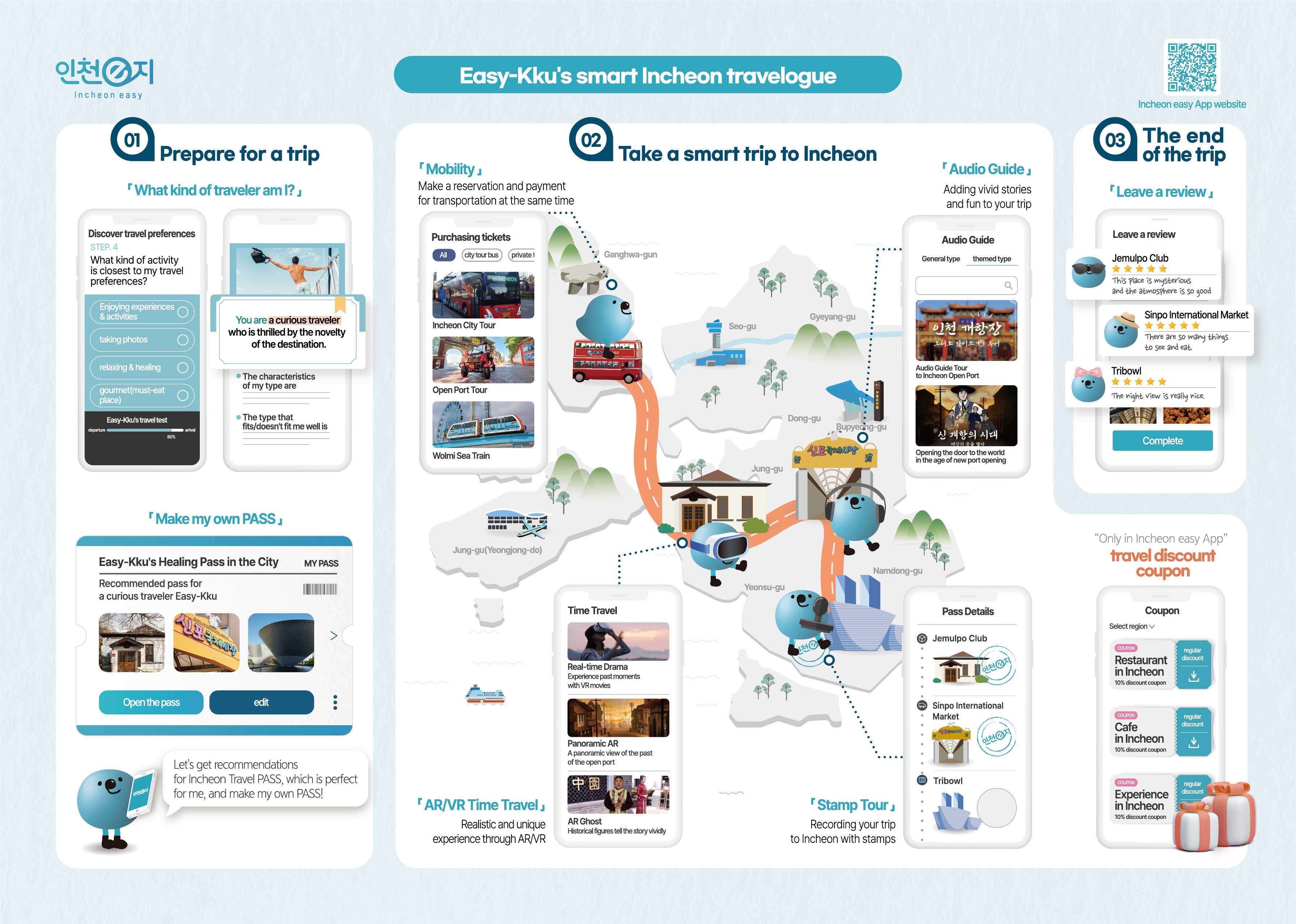 Incheon's travel elements and smart technology are combined into 'Incheon Easy'. It functions diversely and provides smart travel for everyone. 'Audio Guide', 'AI Recommend Pass', and 'Smart Coupon' are 3 functions that can be useful especially for international tourists, therefore highly recommended.