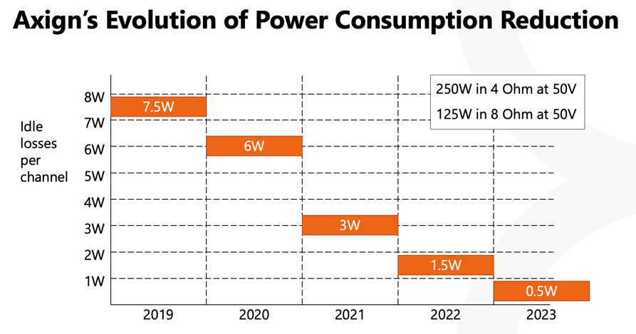 For output powers up to 60W in 4 Ohm BTL per channel, Axign will introduce its own (heatsinkless) two-channel power stages (AX1225 and AX1250), which are further optimized for lowest power consumption levels.