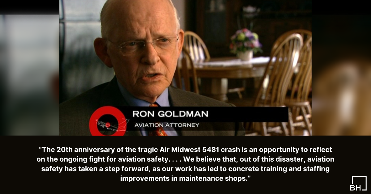 “The 20th anniversary of the tragic Air Midwest 5481 crash is an opportunity to reflect on the ongoing fight for aviation safety. The lives lost, and the loving memories of each precious life, continue to spur our efforts. We believe that, out of this disaster, aviation safety has taken a step forward, as our work has led to concrete training and staffing improvements in maintenance shops. Those improvements are part of the legacy of all those touched by Flight 5481, and I am honored to have played a part in it.”