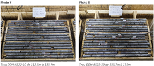 Photo 7: Trou DDH-AS22-10 de 112.5m à 133.7m; Photo 8: Trou DDH-AS22-10 de 133,7m à 155m