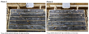 Photo 5: Trou DDH-AS22-04 de 25.4m à 47m; Photo 6: Trou DDH AS22-07 de 130.8m à 152.6m