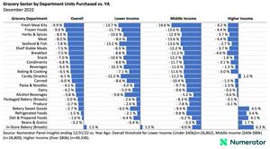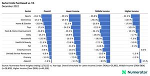In response to higher prices and reflecting the shift from goods to services and from staying home to going out, consumers have cut back on the number of items they purchase overall. These cuts have been larger among lower- and middle-income consumers and in discretionary sectors. The sectors showing the largest declines in unit purchases relative to a year ago are sports, electronics, home & garden, toys, and tools & home improvement. The sectors showing the smallest declines in unit purchases relative to a year ago are pet, entertainment, limited-service restaurants, grocery, and apparel. These declines relative to a year ago reflect lower quantities, not necessarily reduced dollar value of sales (please see Numerator’s Advance Retail Sales Report for changes in the value of nominal sales by sector, to be released on January 17, 2023).