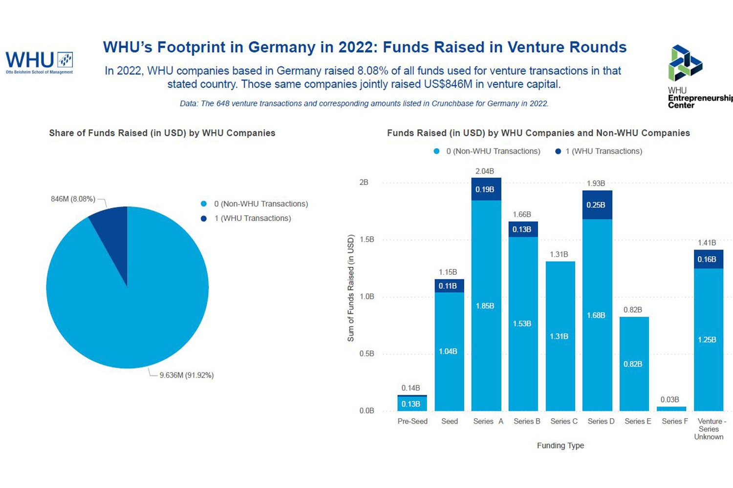 Over the course of 2022, German companies (co-)founded by students and alumni of WHU – Otto Beisheim School of Management collectively raised a staggering US$846M in venture capital funds. Those funds account for 8% of all venture capital funds raised in Germany and reflect 5% of all German-based venture transactions. This is the result of a new analysis conducted by Professor Dries Faems, Chairholder for Entrepreneurship, Innovation and Technological Transformation at WHU.