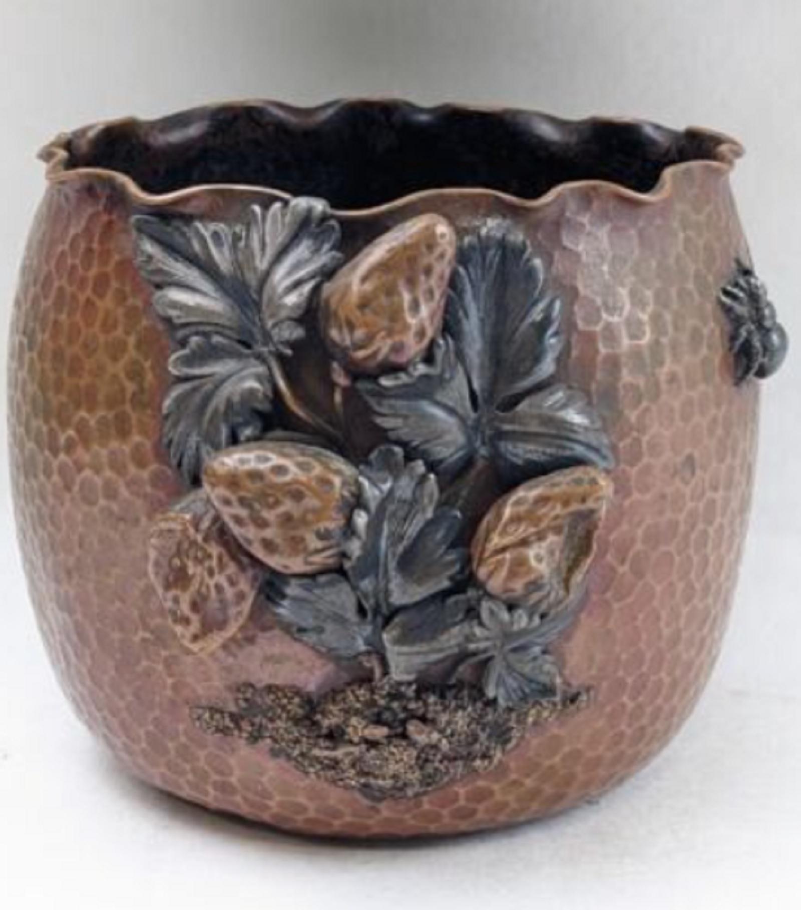 Gorham mixed metals Y50 sterling silver copper jardiniere vase with applied 3-D strawberry plant and spider, never polished, with original patina, 3 ½ inches tall (est. $2,500-$5,000).