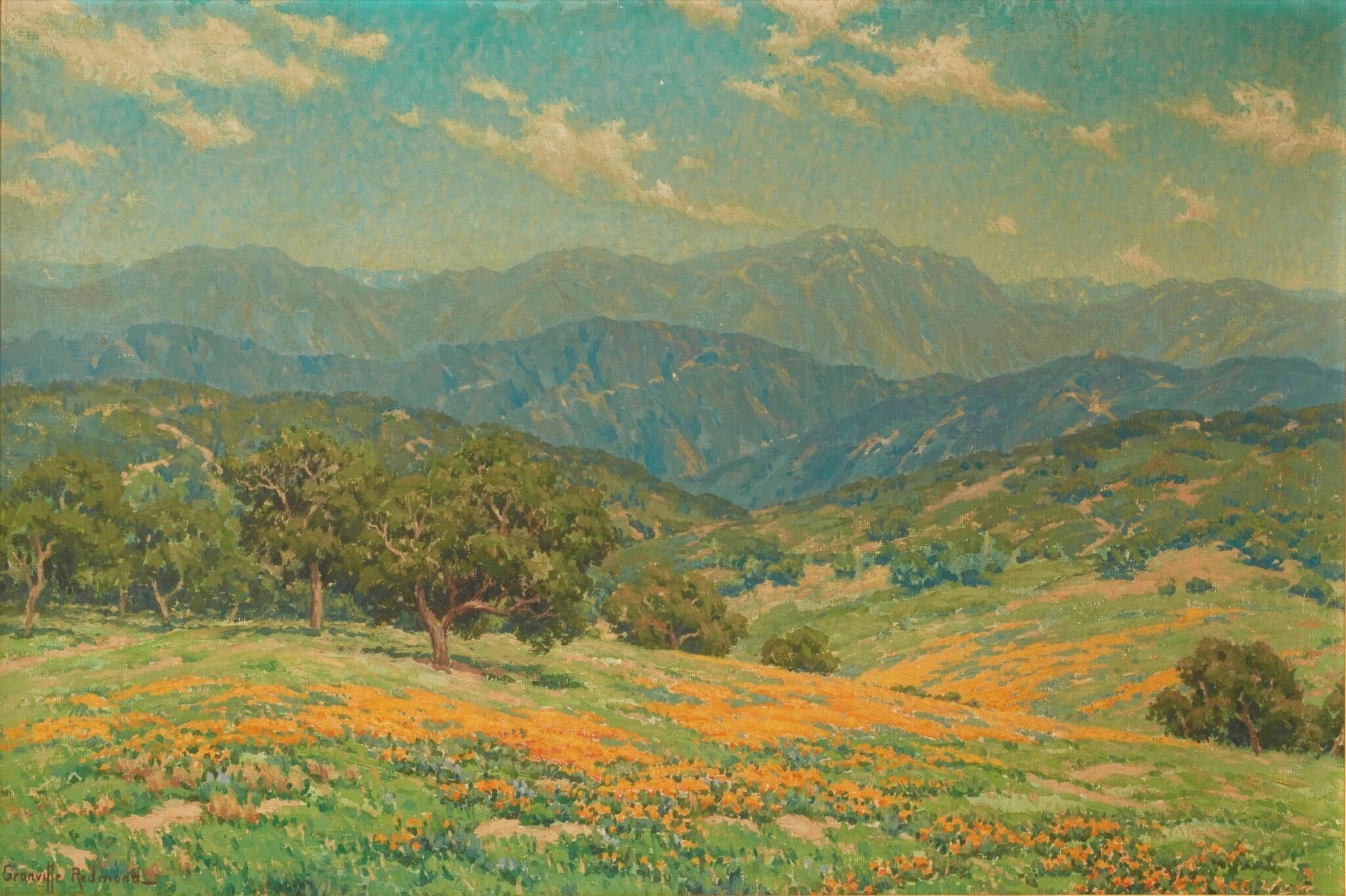Oil on canvas painting by Granville Redmond (American, 1871-1935), titled Rolling hills with California poppies ($237,500).