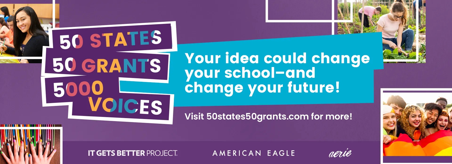 LOS ANGELES, CALIFORNIA, UNITED STATES, January 18, 2023 /EINPresswire.com/ -- The It Gets Better Project, the world’s largest storytelling effort to uplift LGBTQ+ youth, has opened applications for year two of its 50 States. 50 Grants. 5,000 Voices grants initiative. Grants of up to $10K each will be awarded to at least one middle or high school in every US state, including US territories, and fund projects that uplift and support the wellbeing of local LGBTQ+ students. This year, the project will expand into Canada under the name It Gets Better - Youth Grants | It Gets Better - Bourse Jeunesse, with grants awarded to at least one middle or high school in every Canadian province and territory. As with the initiative’s inaugural year, the project is made possible by support from American Eagle Outfitters, Inc. (AEO) through American Eagle and Aerie customer donations in the US and Canada via their Real Rewards loyalty program, as well as an in-store pin-pad promotion during Pride Month 2022.