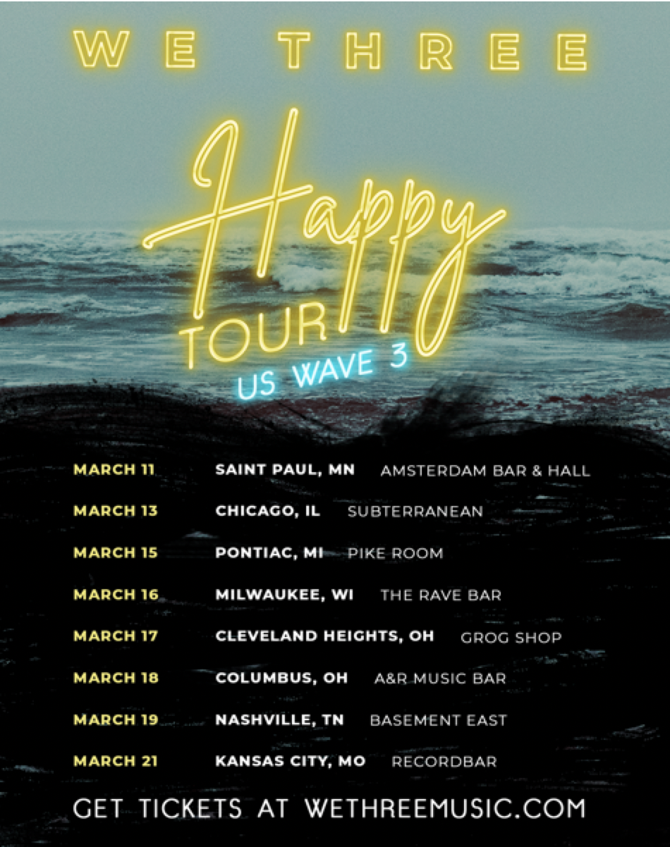 We Three continues their 'Happy Tour' with upcoming shows dates in both New Zealand and Australia. The release of the band's much anticipated US March 2023 tour dates include performances in the states of MN, IL, MI, WI, OH, TN, and MO. Stay on top of all upcoming tour announcements and shows in your area as well as incredible new music at: https://www.wethreemusic.com.