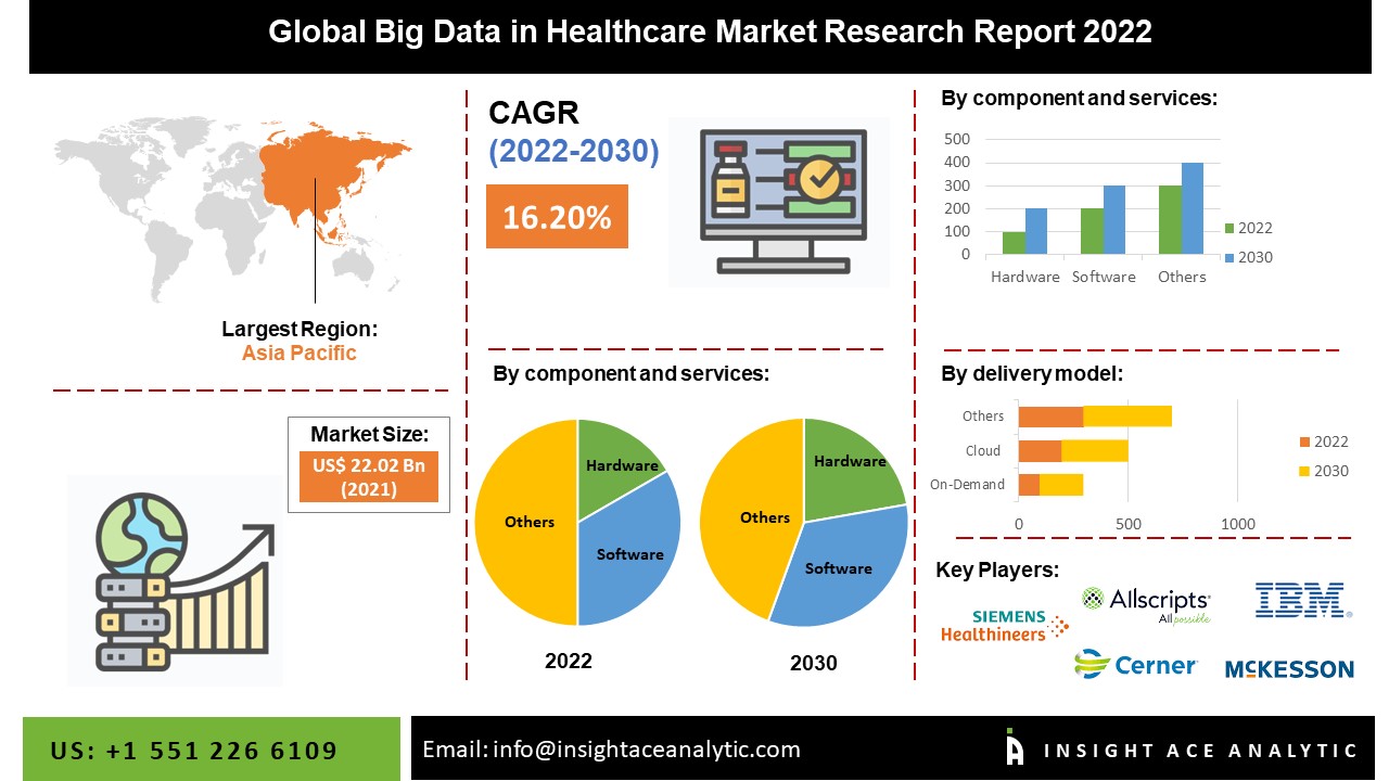 JERSEY, NJ, US, January 25, 2023 /EINPresswire.com/ -- According to the latest research by InsightAce Analytics, the global big data in the healthcare market is valued at US$ 22.02 billion in 2021, and it is expected to reach US$ 84.5 billion by 2030, with a CAGR of 16.20% during the forecast period of 2022-2030.