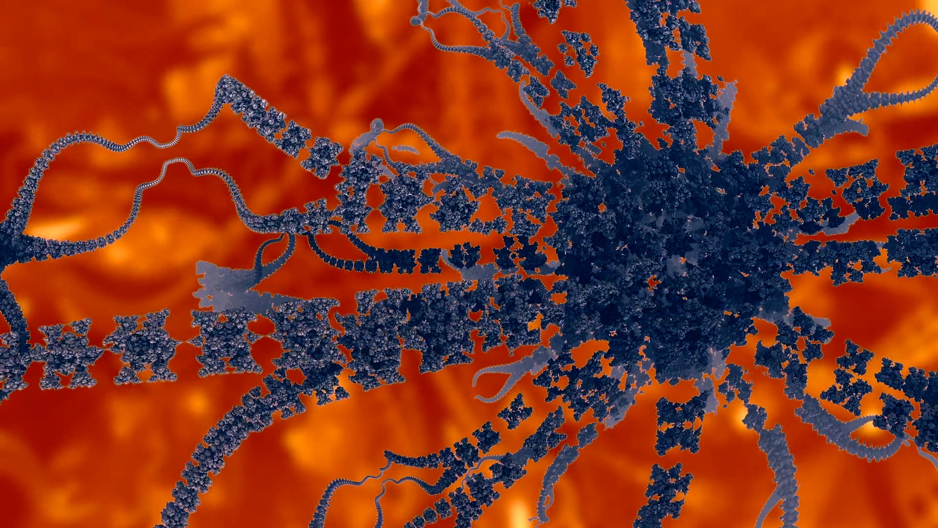 We open on DNA-like strands of metal scaffolding emerging from a fog, eventually revealing a seemingly infinite unraveling of some bio-mechanical network or organism. As the structure folds into increasingly complex iterations of itself, colorful sun-like orbs appear, distorting our view of the mechanical madness with seductive hues. Does the mechanical skeleton come to life?