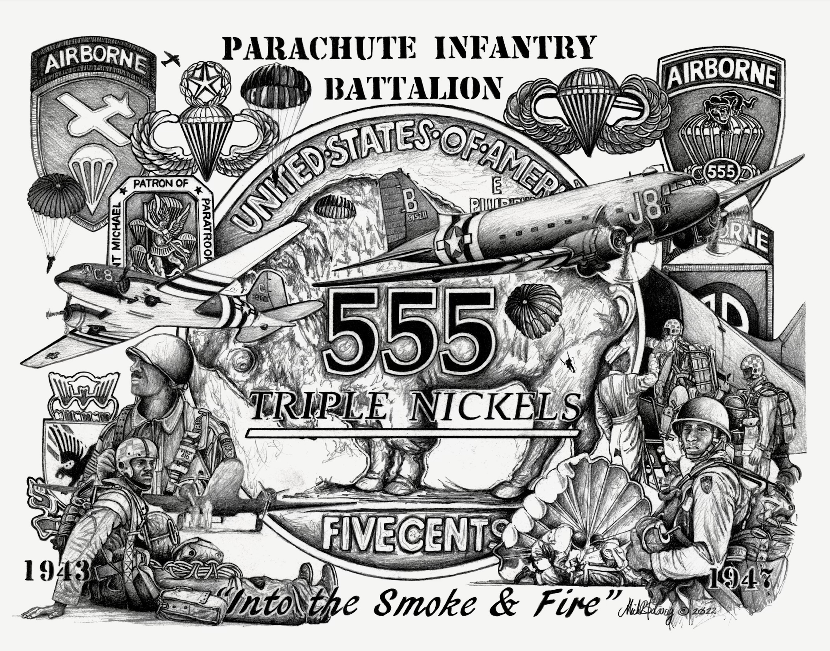 SAN ANTONIO, TEXAS, USA, February 1, 2023 /EINPresswire.com/ -- Triple Nikel, a veteran minority-owned apparel company, has partnered with renowned veteran artist, Michael Solovey, to tell the story of an all black Army unit through art in a piece called, “Into The Smoke and Fire”. The print is an homage to the 555th Parachute Infantry Regiment; also known as the “Triple Nickels”. The unit was activated on December 31, 1943 during a time of segregation in the United States.