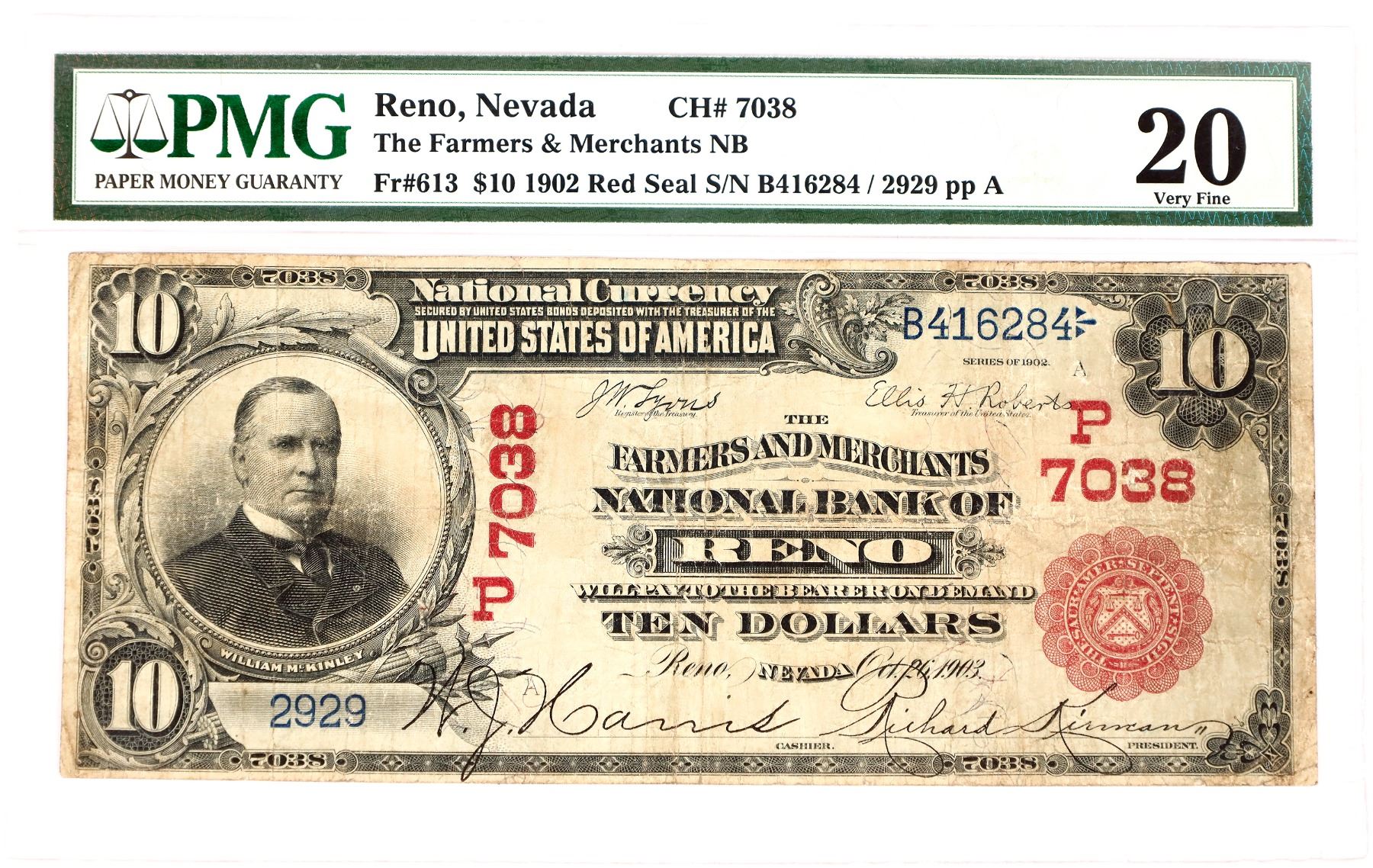 Ten-dollar 1902 red seal banknote from The Farmers & Merchants National Bank in Reno, Nevada, the second finest known of just five red seals reported, PMG Very Fine 20 ($12,500).