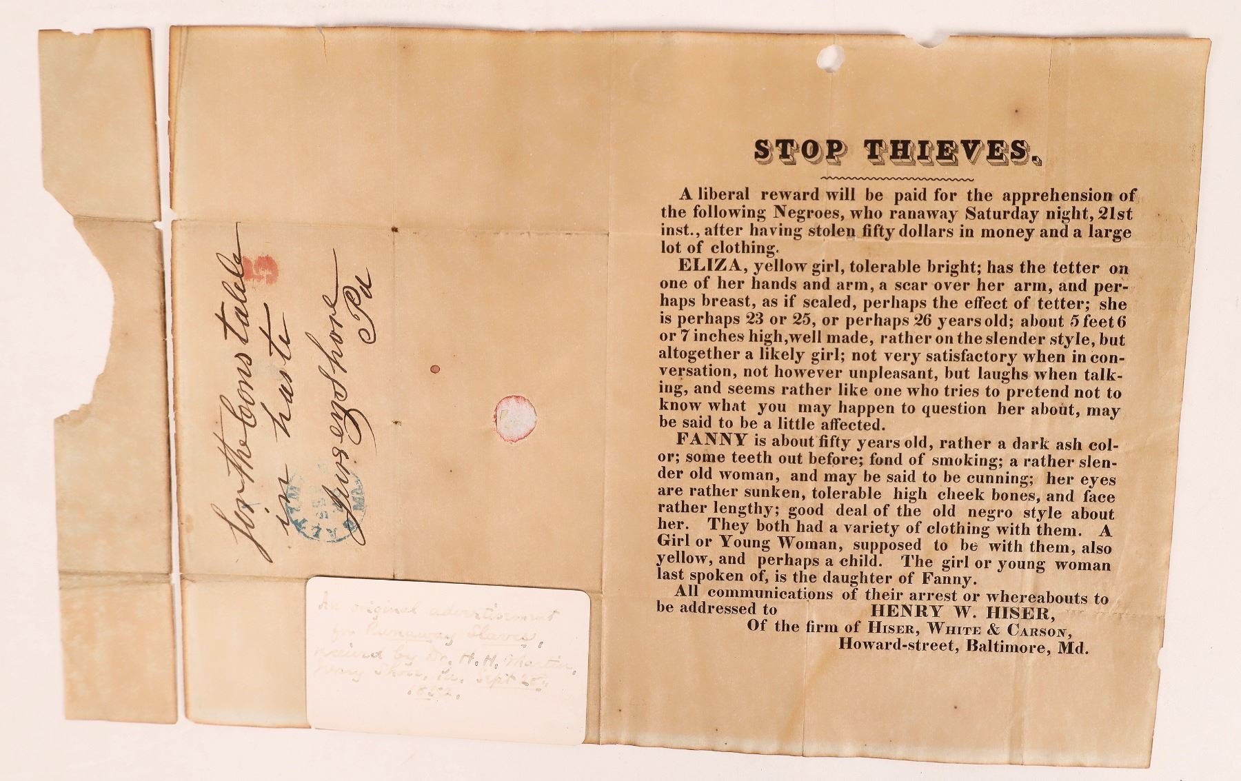 The folded slave broadside, 9 ¾ inches by 13 ½ inches, dated Sept. 28, 1852, offered “a liberal reward for the apprehension of (two) Negroes, who ran away Saturday night, the 21st, having stolen fifty dollars in money and a large lot of clothing.” The runaways were women: Eliza (in her 20s, “well made, rather on the slender side”) and Fanny (about 50 and “fond of smoking”).