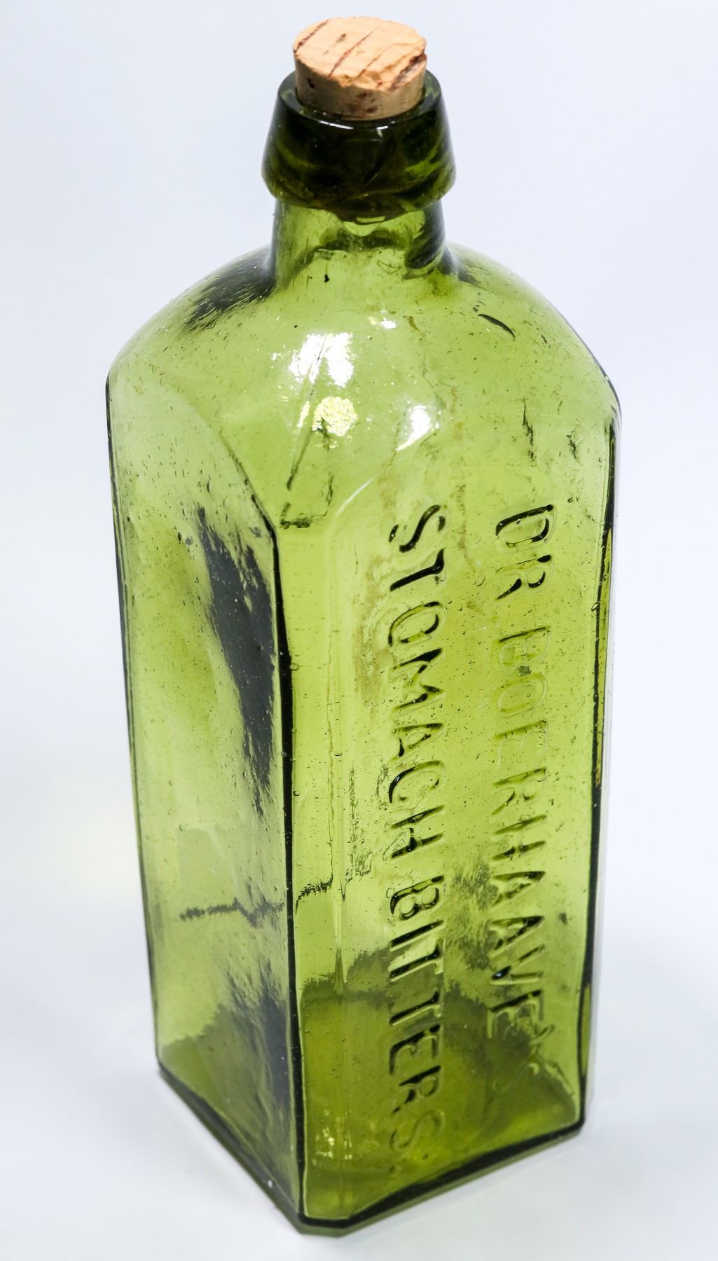 The circa 1868 Dr. Boerhaave’s Stomach Bitters bottle with an applied top, 8 ¾ inches tall, was one of “probably less than six known” (Wichmann, 1999) and “extremely rare” (B133 in Ring). Little is known about this very scarce Western bitters bottle. Other examples of just the handful known are amber and yellow-olive. The one sold is possibly the only dark green lime one extant.