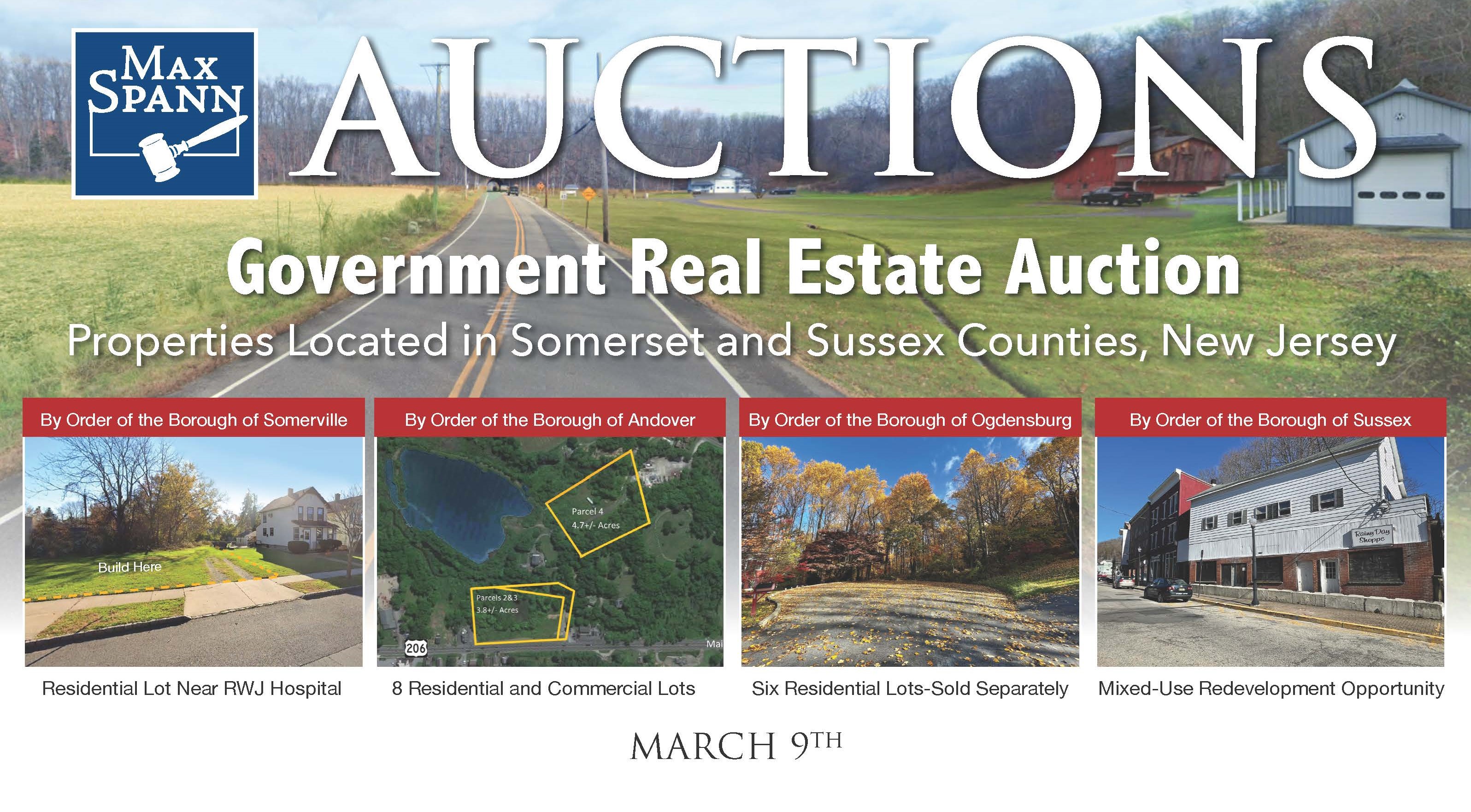 • Borough of Ogdensburg, Sussex County: Six properties will be sold individually, including a potential four-lot subdivision on Main Street, a 5.6+/- acre lot on Main Street, three separate single-family home lots off Richardsville Road, and an 18.56+/- acre lot off Edison Avenue.