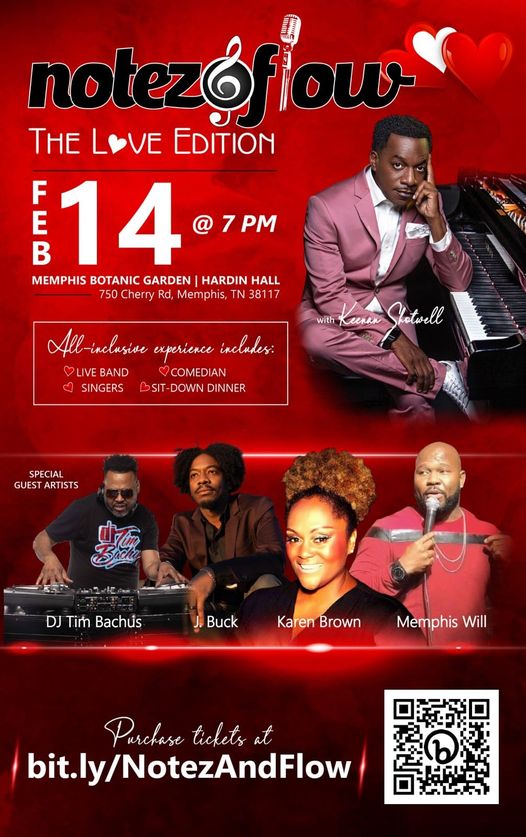 MEMPHIS, UNITED STATES, February 6, 2023 /EINPresswire.com/ -- Those seeking to enjoy live musical entertainment on February 14th can join Notez&Flow: The Love Edition at Memphis Botanic Gardens. This vibrant evening of exceptional talent will be led by producer/songwriter/musician Keenan Shotwell and feature popular vocalists Karen Brown, J. Buck, and comedian Memphis Will. DJ Tim Bachus will keep the party going before, during, and after the show. Memphis Botanic Garden is located at 750 Cherry Rd. The show will begin at 7 p.m.