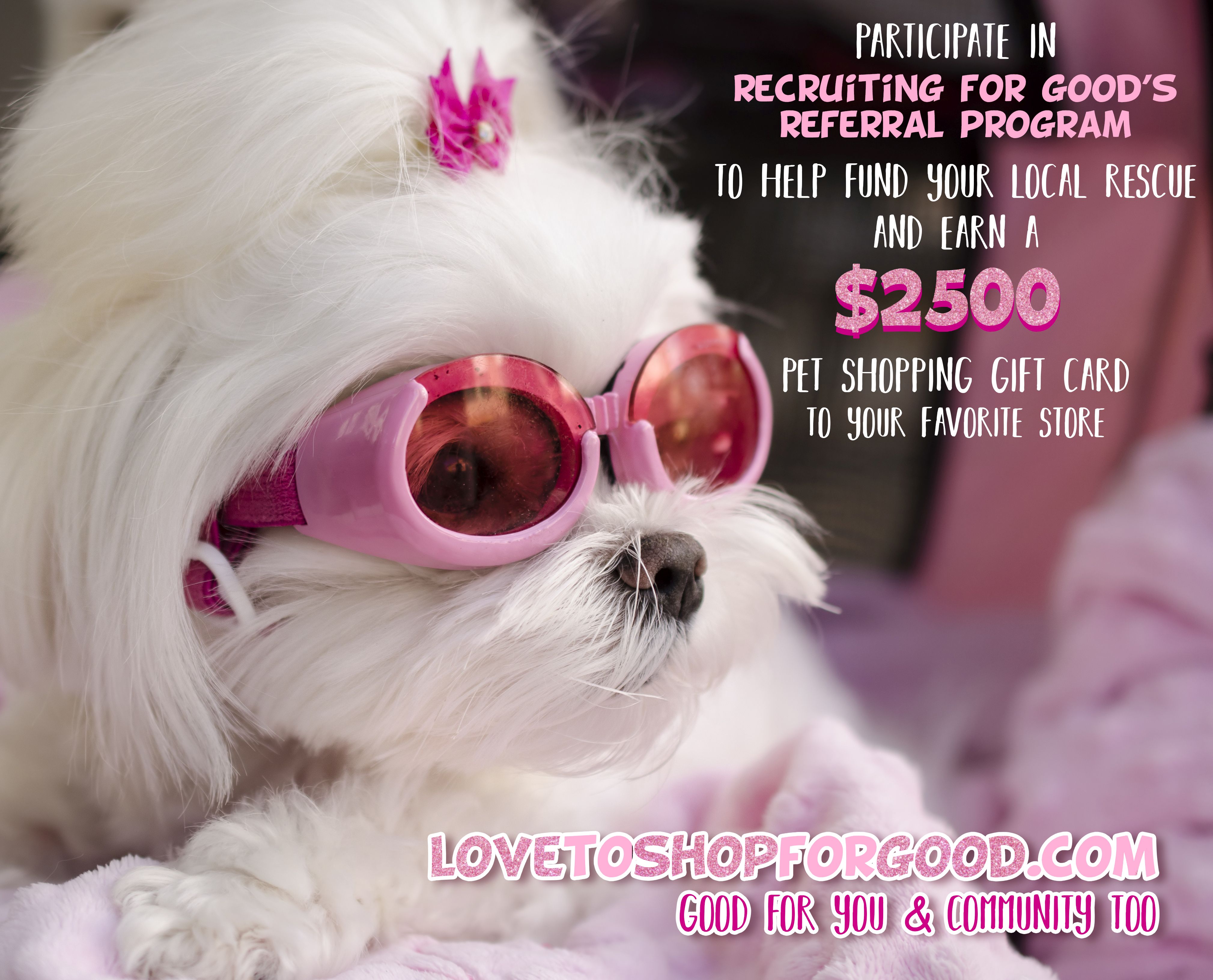 Love to Help Fund Local Pet Rescues and Shop for Good...Participate in Recruiting for Good referral program to earn $2500 Pet Shopping Reward #lovetoshopforgood #recruitingforgood www.LovetoShopforGood.com
