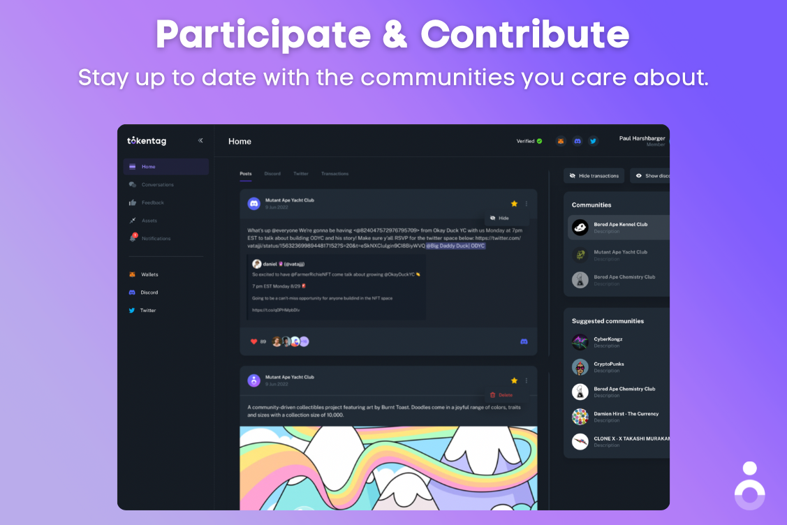 With TokenTag, web3 communities can seamlessly connect through a single customizable and searchable community home page, allowing members to stay in the loop and securely communicate, as well as the ability to discover and explore all that web3 has to offer.