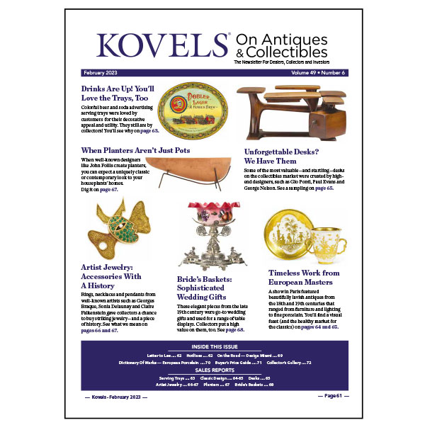 Kovels’ February 2023 newsletter features modern desks, artist jewelry, bride’s baskets, tin advertising trays, and classic design, all with photos and prices.