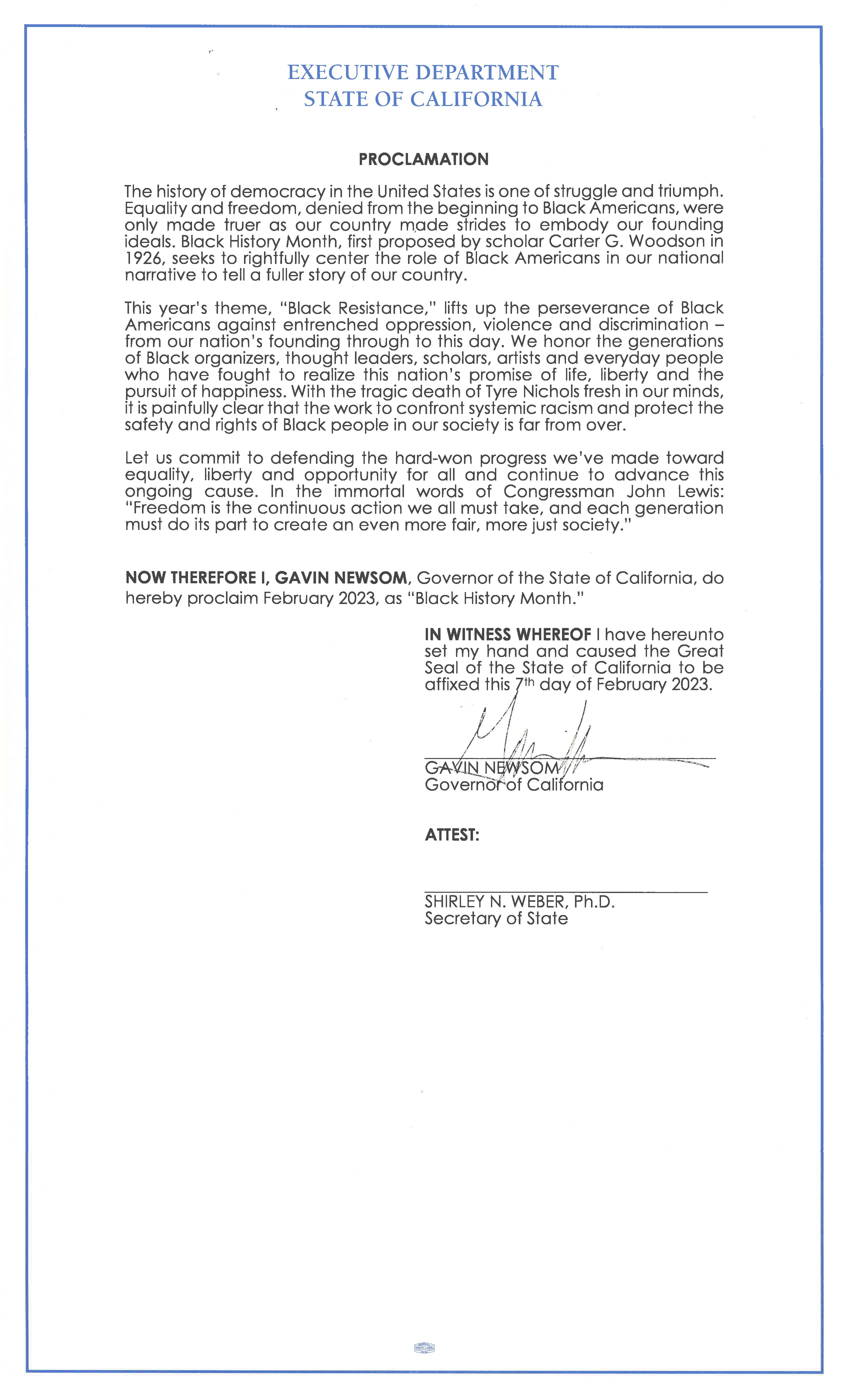 NOW THEREFORE I, GAVIN NEWSOM, Governor of the State of California, do hereby proclaim February 2023, as “Black History Month.”