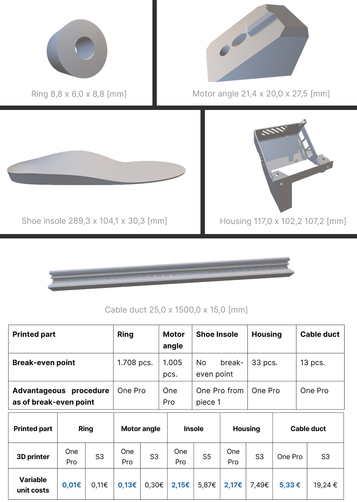 Aufgrund der Einsparungen bei den variablen Kosten erreicht der One Pro im exemplarischen Vergleich immer einen Punkt, an dem die Gesamtproduktionskosten mit diesem Gerät günstiger sind. Der Ultimaker S3 hat rund 9% niedrigere Gesamtfixkosten, was dem geringen Preisunterschied bei den Anschaffungskosten entspricht. Dank geringerer Betriebskosten - sowohl für Personal als auch für Strom - und dem niedrigeren Materialverbrauch, rentiert sich jedoch der Einsatz des Fließbanddruckers je nach Objekt über kurz oder lang immer.