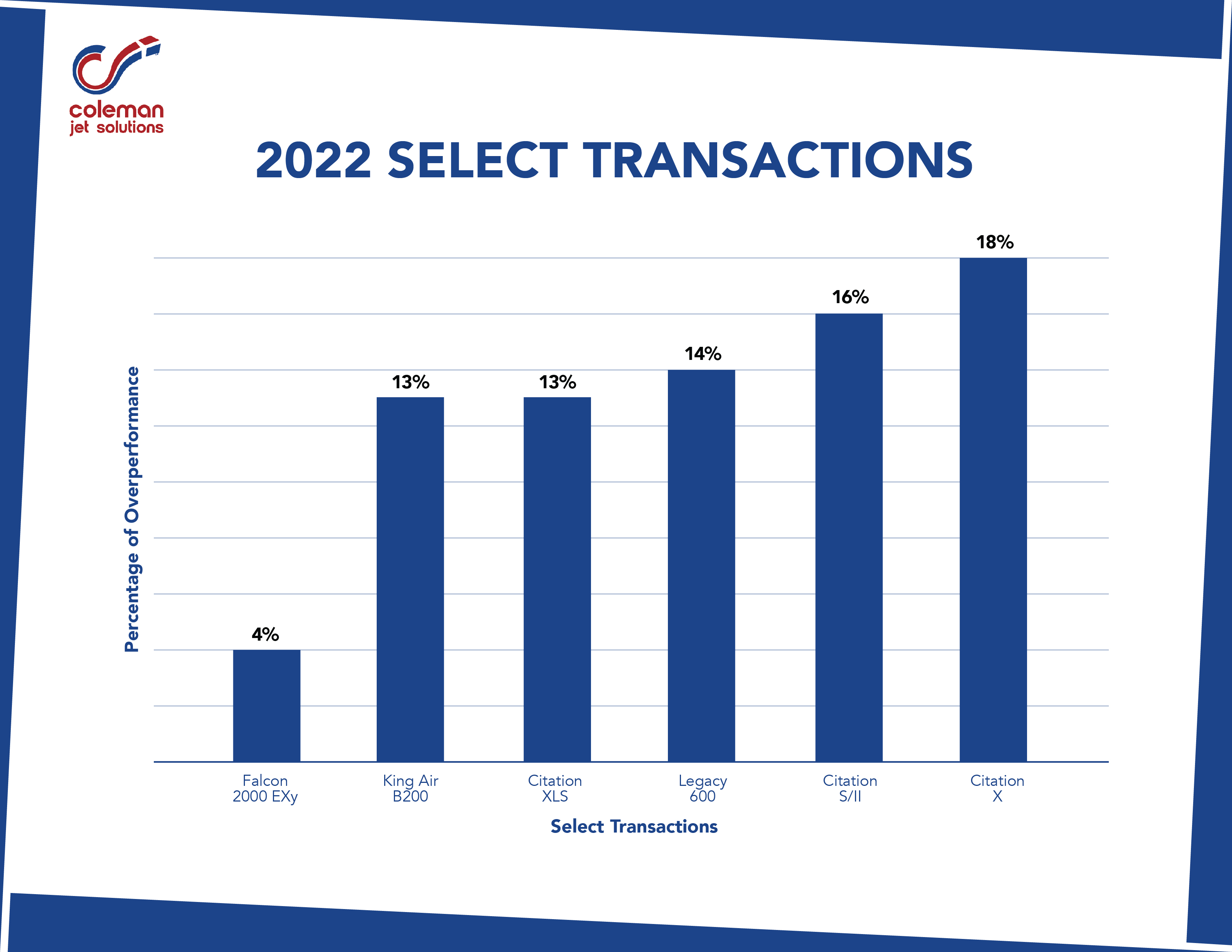 Coleman Jet Solutions has dedicated significant resources towards aircraft marketing, transaction management, intelligence gathering and aircraft analysis. “In many instances, Coleman Jets was the market-maker in 2022”, says Mike Pryor, Director of Market Intelligence. “After making adjustments for effects of the rising market, our market overperformance demonstrates that our processes work and that promises made are promises kept.”