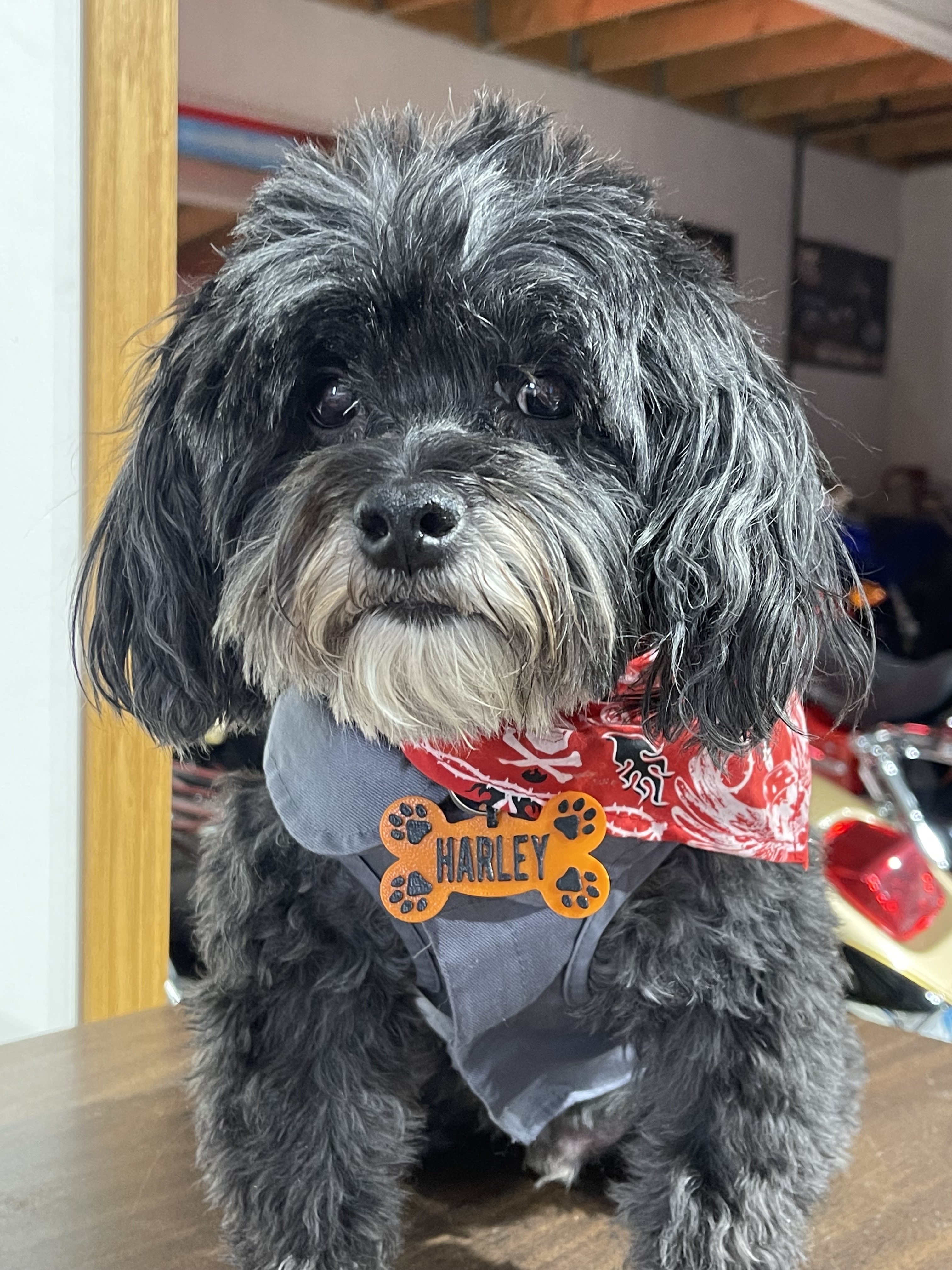 Richardson grew up with dogs just 20 miles from his grandparents’ farm in Kingsley, Iowa. The inspiration for The Dog Pouch is Harley, a tough-love yorkie-poo who wears his motorcycle gear and clothing with pride.
