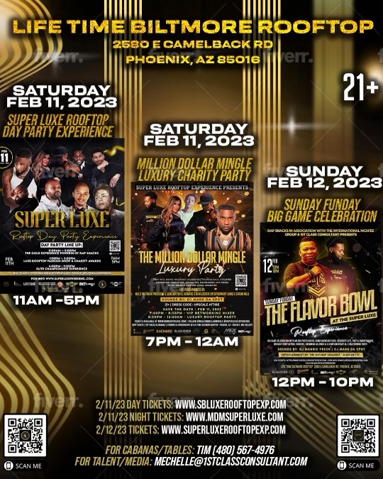 The activities are non-stop starting on Saturday with the Super Luxe Rooftop Day Party. Those who show up at 11 AM can begin with the Rap Snacks’ The Gold Experience’s complimentary food, curated content, vendors & product sampling, followed by, from 1-3 PM, the Luxe Charity Fashion Show, mini-concert, and Arizona Game Changer Awards.